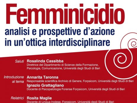 Il 9 aprile dalle ore 9.00 alle 13.00 si terrà il seminario di studio organizzato dal Dipartimento di Scienze della Formazione, Psicologia e Comunicazione dell’Università degli Studi di Bari “A.Moro” e patrocinato dall’Ordine degli Psicologi della Regione Puglia, dal titolo “Femminicidio: analisi e prospettive d’azione in un’ottica interdisciplinare”.