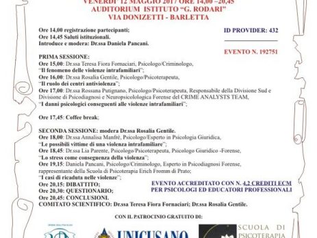 Il prossimo evento patrocinato dall’Ordine degli Psicologi di Puglia è il convegno Gli aspetti delle violenze intrafamiliari organizzato da Obiettivo Formazione srls, il 12 maggio dalle 14:00 alle 20:45 presso Auditorium “G. Rodari” di Barletta.