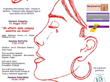La giornata formativa “Gli effetti della violenza assistita sui minori”, patrocinata dall’Ordine, si terrà il 21 maggio dalle 9 alle 19 presso la Biblioteca storica (piazza Sacra Regia Udienza n°9) dell’Ordine degli Avvocati di Trani.