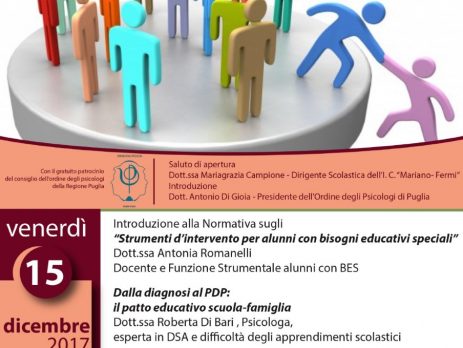 Segnaliamo l’evento patrocinato dall’Ordine degli Psicologi di Puglia sul tema dei bisogni educativi speciali alla presenza di genitori, docenti ed esperti nel trattamento di alunni con BES.