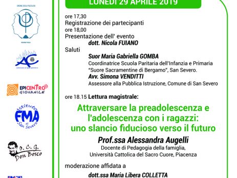 Alle 18:15 si svolgerà la Lettura magistrale “Attraversare la preadolescenza e l’adolescenza con i ragazzi: uno slancio fiducioso verso il futuro” a cura della prof.ssa Alessandra Augelli, docente di Pedagogia della famiglia presso l’Università Cattolica del Sacro Cuore di Piacenza.