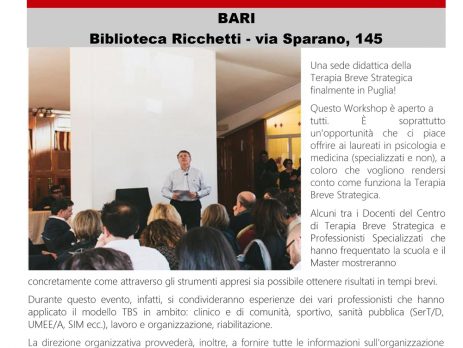 L’evento, gratuito ed aperto a tutti, sarà occasione per illustrare il metodo della Terapia Breve Strategica (TBS) e il percorso accademico associato.