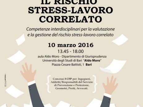Giovedì 10 marzo, presso l’Aula Aldo Moro dell’Università degli Studi di Bari, il convegno interdisciplinare “IL RISCHIO STRESS LAVORO CORRELATO, competenze interdisciplinari per la valutazione e la gestione del rischio stress-lavoro correlato”.