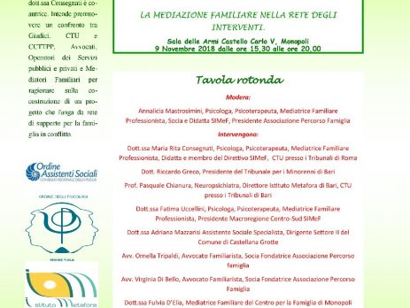 Il 9 novembre 2018, presso la Sala delle Armi del Castello Carlo V di Monopoli, dalle ore 15:30 alle ore 20:00, si terrà la Tavola Rotonda “Il sistema familiare separato nel conflitto: la costruzione degli interventi dai tribunali ai servizi nel territorio. La mediazione familiare nella rete degli interventi”.