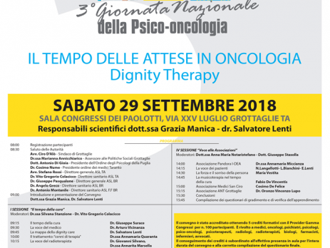 In occasione della 3^ Giornata Nazionale di Psico Oncologia, si svolgerà l’evento “Il tempo delle attese in Oncologia – Dignity Therapy” presso la Sala Congressi Paolotti di Grottaglie, in via XXV luglio.