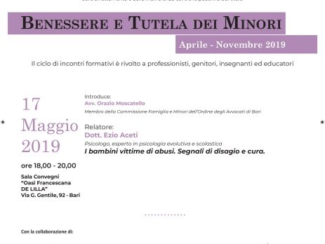 Per il ciclo di incontri formativi “Benessere e Tutela dei Minori”, vi invitiamo all’evento del 17 Maggio 2019 “I bambini vittime di abusi. Segnali di disagio e cura.”