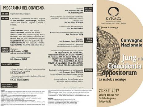 Segnaliamo il Convegno Nazionale “Jung e la Coincidentia oppositorium” organizzato dall’Associazione Junghiana Salentina di Gallipoli e patrocinato dall’Ordine degli Psicologi di Puglia.