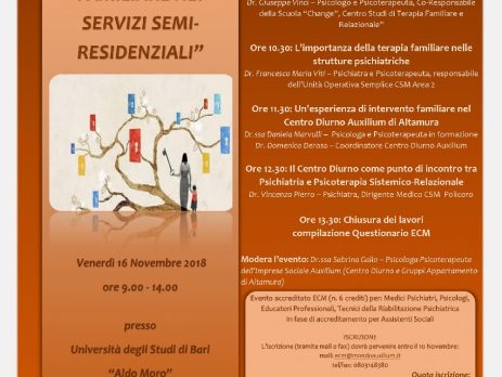Il prossimo 16 novembre, dalle ore 9 alle 14, presso l’Aula Magna “A.Cossu” dell’Università degli Studi di Bari si svolgerà il convegno ECM “La terapia familiare nei servizi semi-residenziali” organizzato dall’impresa sociale Auxilium – Aiuto alla persona di Altamura e patrocinato dall’Ordine degli Psicologi di Puglia.
