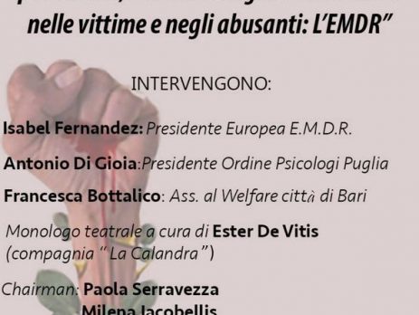 L’Ordine degli Psicologi della Regione Puglia è lieta di invitarvi all’evento “La violenza domestica_ fattori di rischio e protezione, nuove strategie di intervento nelle vittime e negli abusati” organizzato dall’EDMR, l’Associazione Italiana Eye Movement Desensitization and Reprocessing.