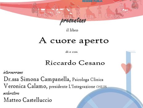 Mercoledì 23 maggio, a partire dalle ore 18:30, presso il Centro Sociale Anziani di Castromediano Cavallino, si terrà la presentazione del libro “A cuore aperto” di e con Riccardo Cesano, evento patrocinato dall’Ordine.