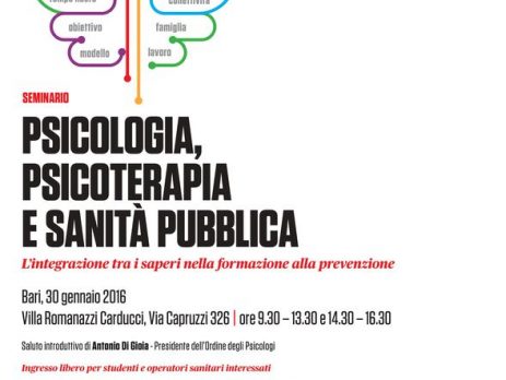 L’Ordine degli Psicologi della Puglia patrocina il seminario organizzato dalla Scuola di Specializzazione in Psicoterapia Change dal titolo “Psicologia, Psicoterapie e Sanità Pubblica” in programma sabato 30 gennaio a Bari presso Villa Romanazzi Carducci a partire dalle ore 9,30.