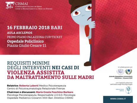 L’evento, organizzato dal Cismai (Coordinamento Italiano dei Servizi contro il Maltrattamento e l’Abuso all’Infanzia), con il patrocinio dell’Ordine degli Psicologi di Puglia e dell’Azienda Ospedaliero-Universitario del Policlinico di Bari.