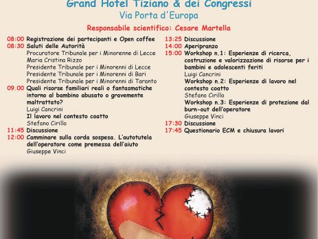 Segnaliamo l’evento gratuito del prossimo 30 ottobre 2017 a Lecce, presso l’Hotel Tiziano & Confressi, dal titolo “Una complessa e necessaria alleanza: il lavoro terapeutico e socio-educativo con le famiglie di bambini e adolescenti feriti”.