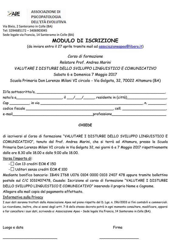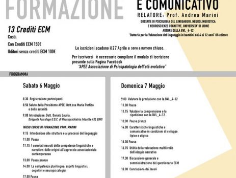 Il corso di formazione Valutare i disturbi dello sviluppo linguistico e comunicativo organizzato da APEE, l’Associazione di Psicopatologia dell’Età Evolutiva, si terrà il prossimo 6 e 7 maggio presso la scuola “don Lorenzo Milani” di Altamura.