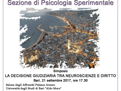 Nell’ambito del XXII Congresso Nazionale della Sezione Sperimentale che si terrà a Bari il 20-22 Settembre 2017, il 21 settembre si terrà il simposio La decisione giudiziaria tra neuroscienze e diritto presso il Salone degli Affreschi presso il palazzo Ateneo dell’Università degli Studi di Bari “A.Moro”.