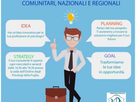 A beneficio, dunque, degli iscritti interessati, l’Ordine degli Psicologi della Regione Puglia ha attivato un indirizzo di posta dedicato (sportello@psicologipuglia.it), ed un numero telefonico 392/7861641 (attivo per informazioni nei giorni: mercoledi e venerdi dalle 16.30 alle 17.30), mediante il quale ognuno potrà richiedere un incontro dedicato per conoscere le modalità ed i termini del finanziamento pubblico erogabile a sostegno della propria iniziativa professionale, anche in termini di autoimpiego.