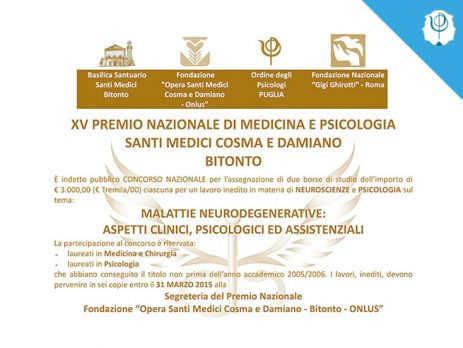 Per la prima volta nella storia decennale del Premio, l’Ordine degli Psicologi della Regione Puglia partecipa a questa iniziativa. Il concorso indetto è a carattere nazionale per l’assegnazione di due borse di studio dell’importo di € 3.000,00 ciascuna per un lavoro inedito in materia di neuroscienze e psicologia sul tema_ MALATTIE NEURODEGENERATIVE_ ASPETTI CLINICI, PSICOLOGICI ED ASSISTENZIALI.