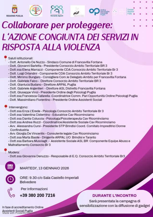 Il Consorzio Ambito BR3 di Francavilla Fontana e il CAV Ricominciamo , gestito dalla cooperativa Aporti, organizzano il 13 gennaio 2026 alle ore 9:30, il convegno "Collaborare per proteggere...