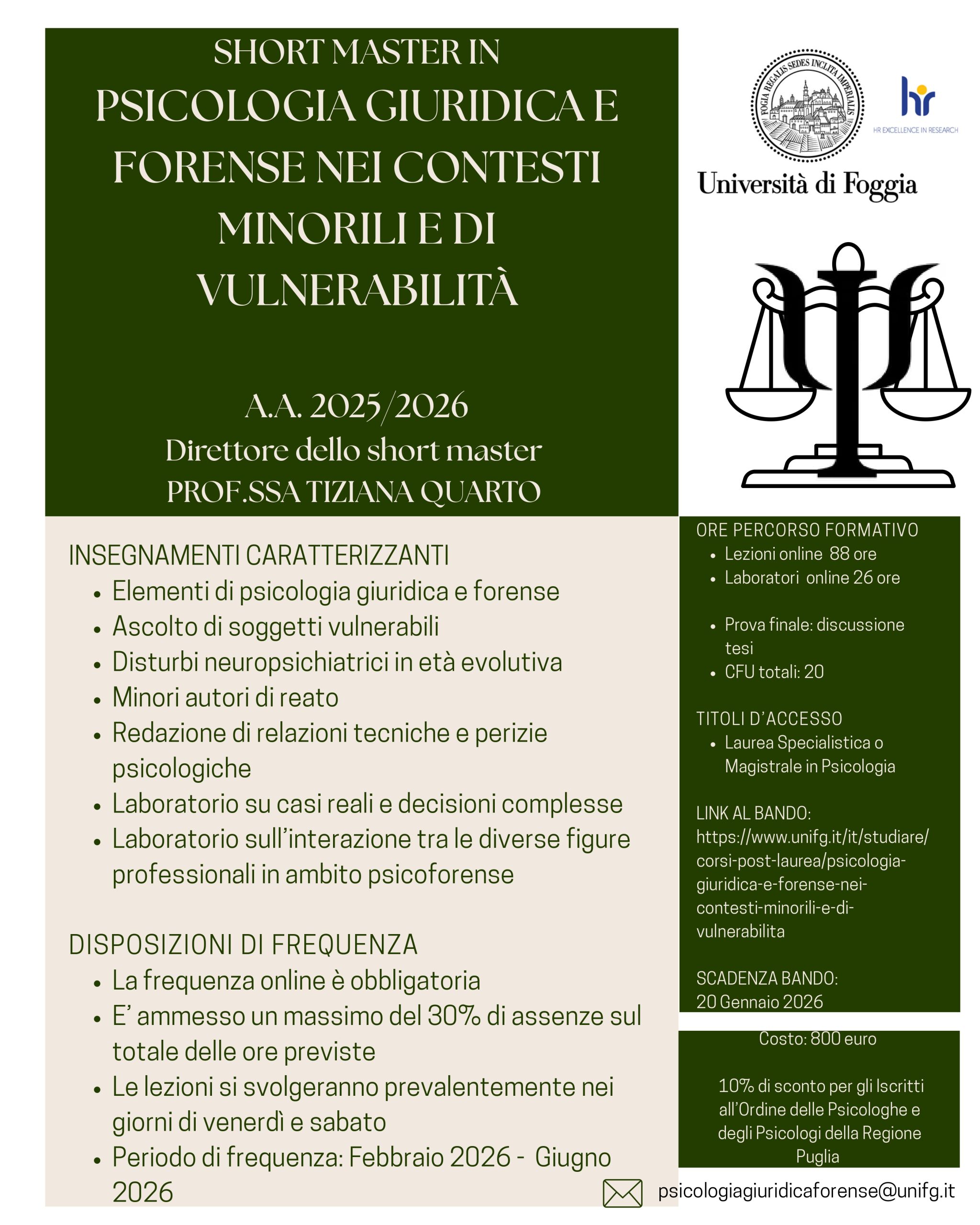 Short Master “Psicologia giuridica e forense nei contesti minorili e di vulnerabilità” – proroga delle iscrizioni