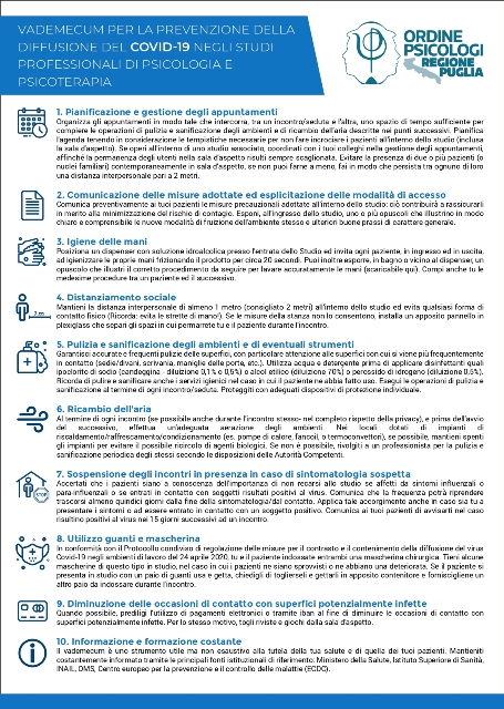 Vademecum per la prevenzione della diffusione del Covid-19 negli studi professionali di Psicologia e Psicoterapia