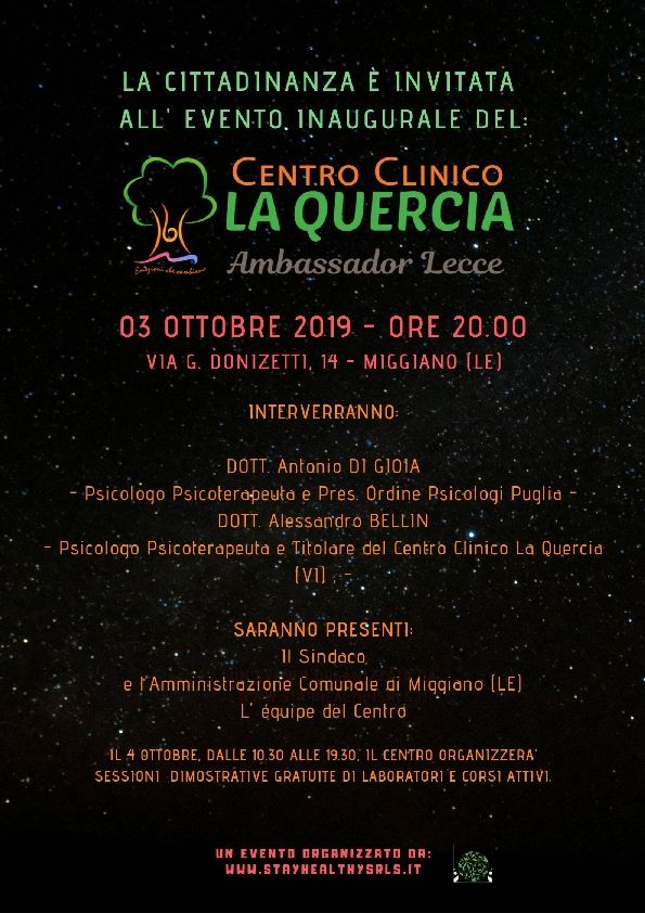 Siamo lieti di invitarvi all'evento inaugurale del Centro Clinico "La Quercia" Ambassador Lecce che si terrà domani 03 ottobre 2019 alle ore 20.00. Interverranno il Dott. Antonio Di...