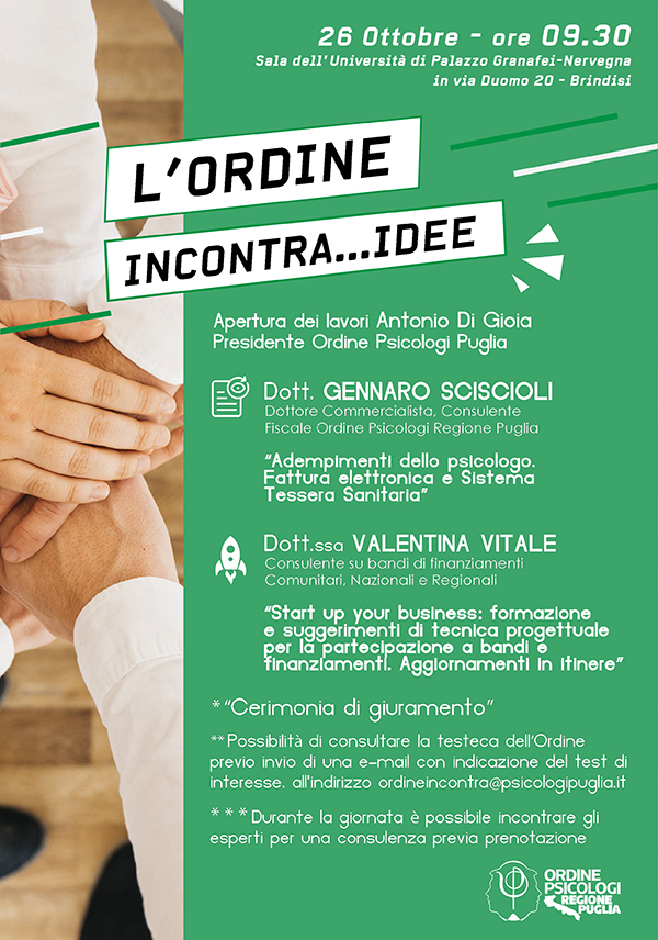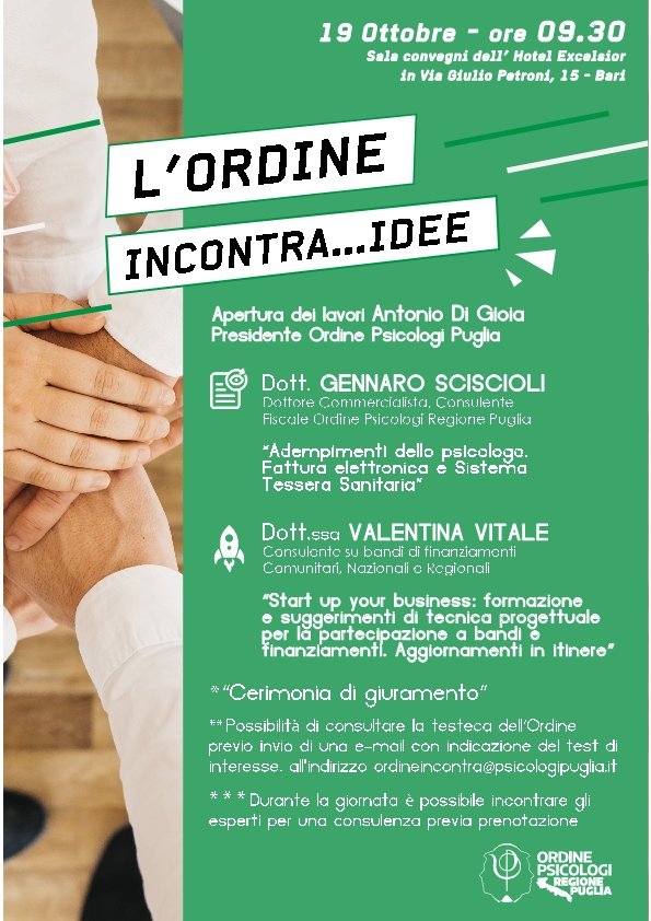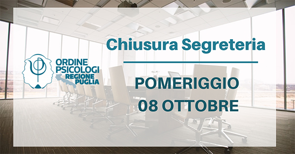 Si comunica che la Segreteria dell'Ordine degli Psicologi della Regione Puglia sarà chiusa al pubblico il pomeriggio del giorno 8 ottobre 2019 in occasione dell’evento l’ORDINE INCONTRA...IDEE previsto...