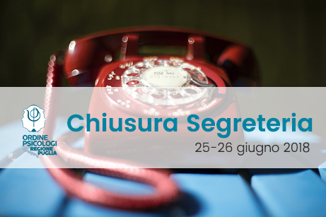 La Segreteria sarà chiusa al pubblico nelle giornate del 25 e 26 giugno 2018 in occasione del Convegno organizzato dall’Ordine a Trani nelle stesse giornate.