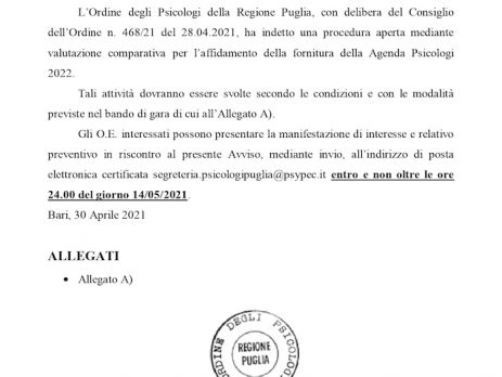 L’Ordine degli Psicologi della Regione Puglia, con delibera del Consiglio dell’Ordine n. 468/21del 28.04.2021, ha indetto una procedura aperta mediante valutazione comparativa per l’affidamento della fornitura della Agenda Psicologi 2022.