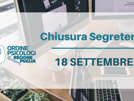 La segreteria dell’Ordine degli Psicologi Puglia rimarrà chiusa per la data del 18 Settembre in occasione del Convegno organizzato dall’Ordine degli Psicologi della Regione Puglia “Psicologia in digitale. Dal passaparola all’epoca del social network”.