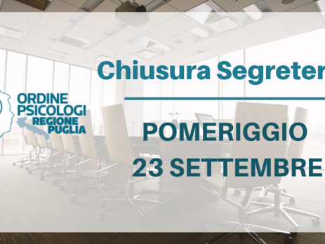 Si comunica che la Segreteria dell’Ordine degli Psicologi della Regione Puglia sarà chiusa al pubblico il pomeriggio del giorno 23 Settembre in occasione dell’evento organizzato a Trani “Ordine incontra BAT”.