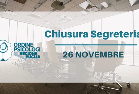 Novembre 26, 2019 Chiusura al pubblico della segreteria per la data del 26 NOVEMBRE 9dt3vn2019-11-26T10:11:07+01:00 Si comunica che la Segreteria dell’Ordine degli Psicologi della Regione Puglia sarà chiusa al pubblico per il giorno 26 NOVEMBRE. Condividi questo post Facebook cinguettio LinkedIn E-mail WhatsApp