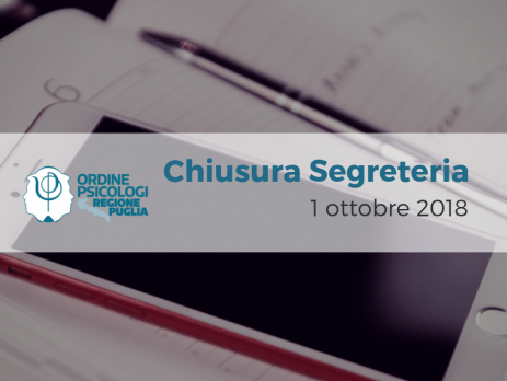 Si comunica che gli uffici della Segreteria saranno chiusi per la giornata del 1 ottobre in occasione del convegno organizzato dall’Ordine “Psicologia e Comunità. Sviluppo del Territorio”