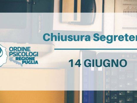 Si comunica che, in occasione del Convegno organizzato dall’Ordine degli Psicologi della Regione Puglia “Prevenzione e Intervento sul Burnout nelle Professioni di Aiuto: dal monitoraggio ai diversi approcci integrativi”, la Segreteria resterà chiusa il giorno 14 giugno.