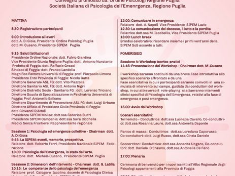 Vi invitiamo al Convegno organizzato dall’Ordine degli Psicologi della Regione Puglia, sul tema “DALL’EMERGENZA ALLA NORMALITA’ IL RUOLO DELLA PSICOLOGIA DELL’EMERGENZA”.
