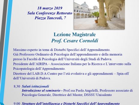 Il 18 marzo si svolgerà il seminario del Prof. Cesare Cornoldi, nell’ambito del Master Interdipartimentale II livello in Esperto in Valutazione e Riabilitazione Neurocognitiva dell’età evolutiva, dell’età adulta e dell’anziano organizzato dall’Università del Salento e convenzionato con l’Ordine degli Psicologi Regione Puglia.
