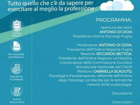 “Psicologo Oggi: sfide & opportunità. Tutto quello che c’è da sapere per esercitare al meglio la professione” è il titolo dei tre incontri organizzati dall’Ordine degli Psicologi della Regione Puglia dedicato all’approfondimento di tematiche attinenti l’esercizio della professione: GDPR & Privacy, Fatturazione elettronica, Preventivi e compensi, nuova Modulistica.