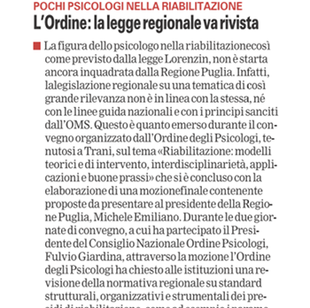 Gazzetta del Mezzogiorno – Pochi Psicologi nella riabilitazione. L’Ordine: la legge regionale va revisionata
