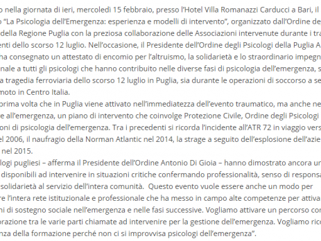 Oltre Free press, quotidiano di notizie di attualità, politica, cultura, turismo, sport e spettacoli dedica un articolo all’evento dello scorso 15 febbraio 2017, La Psicologia dell’Emergenza.