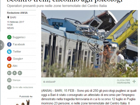Febbraio 16, 2017 “Scontro teni, encomio agli psicologi. Operatori presenti pure nelle zone terremotate del Centro Italia” – Ansa – 15 febbraio 2017 9dt3vn2022-01-05T15:46:07+01:00 L’evento del 15/02 anche su ANSA.it Condividi questo post Facebook cinguettio LinkedIn E-mail WhatsApp