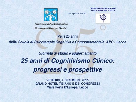 Caratteristica di spicco della APC è sempre stato il collegamento dei temi clinici con le nuove acquisizioni delle scienze cognitive, integrando nel corpus formativo la ricerca e l’aggiornamento su tali temi, tutto ciò espressione della ferma convinzione di Francesco Mancini, direttore della APC, di identificare nel dialogo tra clinica e ricerca un punto di forza. A tale proposito non può che essere sottolineato il ruolo di Cristiano Castelfranchi, insieme a tanti altri colleghi, parte integrante della formazione teorica. L’obiettivo di questa giornata celebrativa è la riflessione critica sul cammino che il cognitivismo clinico ha percorso in questi 25 anni e sulle possibili direzioni future. La giornata sarà dedicata anche all’aggiornamento su alcune procedure di intervento psicoterapeutico.