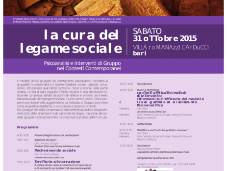 Le inoltriamo la locandina e la scheda di iscrizione relativi al Convegno che si terrà il giorno 31 ottobre a Bari presso l’Hotel Mercure Villa Romanazzi Carducci Carducci, in Via Capruzzi 326 – sul tema “LA CURA DEL LEGAME SOCIALE”.